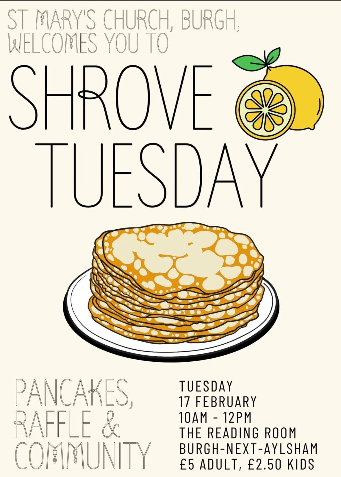 St Mary’s Church invites you to Shrove Tuesday at The Reading Room in Burgh for some pancakes, coffee, raffle and community.